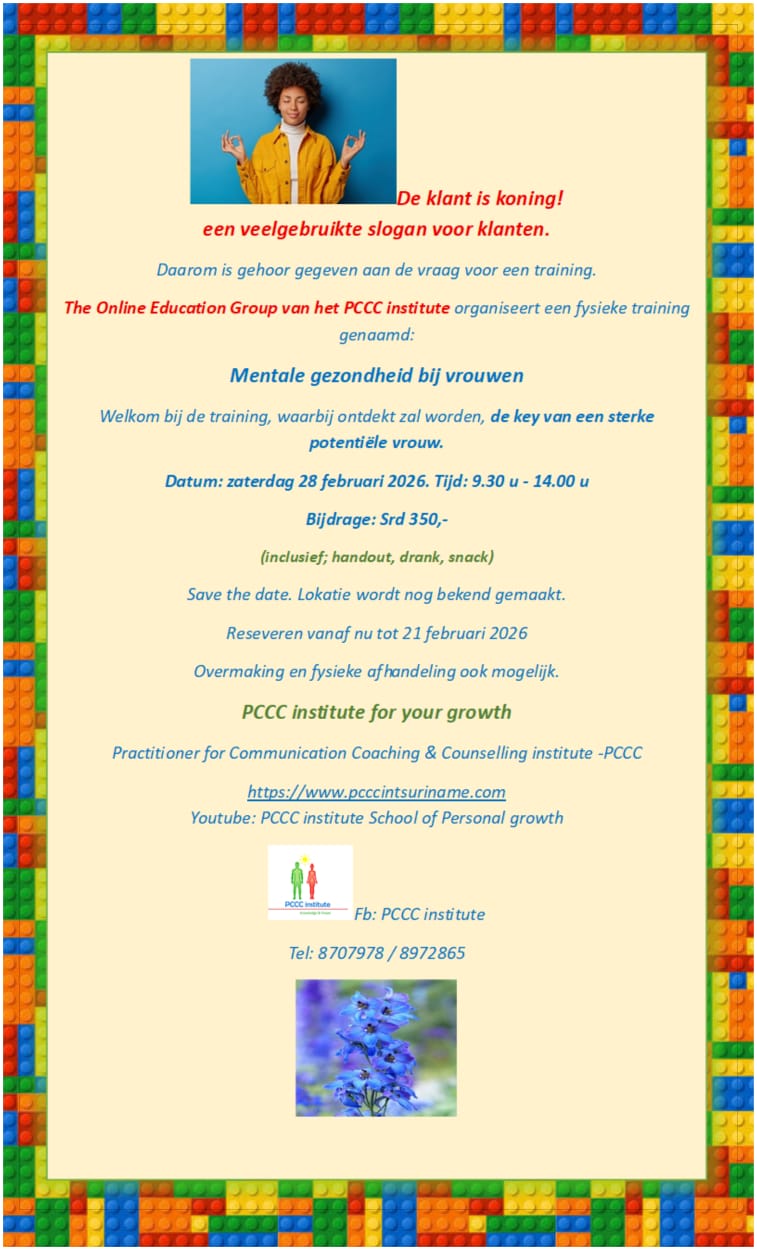 4. The training school is special. So, I'm looking forward to you. Join us and discover your best self. Go to our website www. pcccintsuriname.com and call 8707978 for more information and registration. You're welcome.